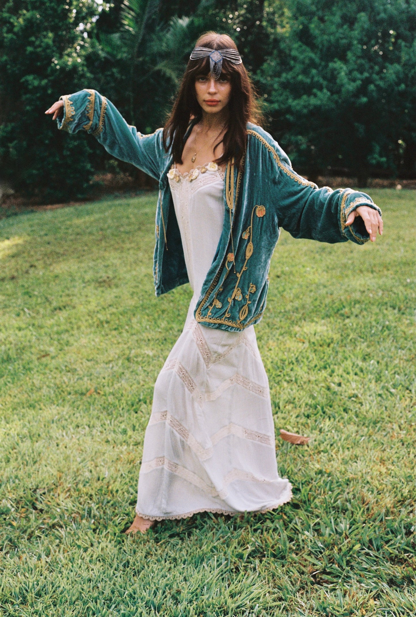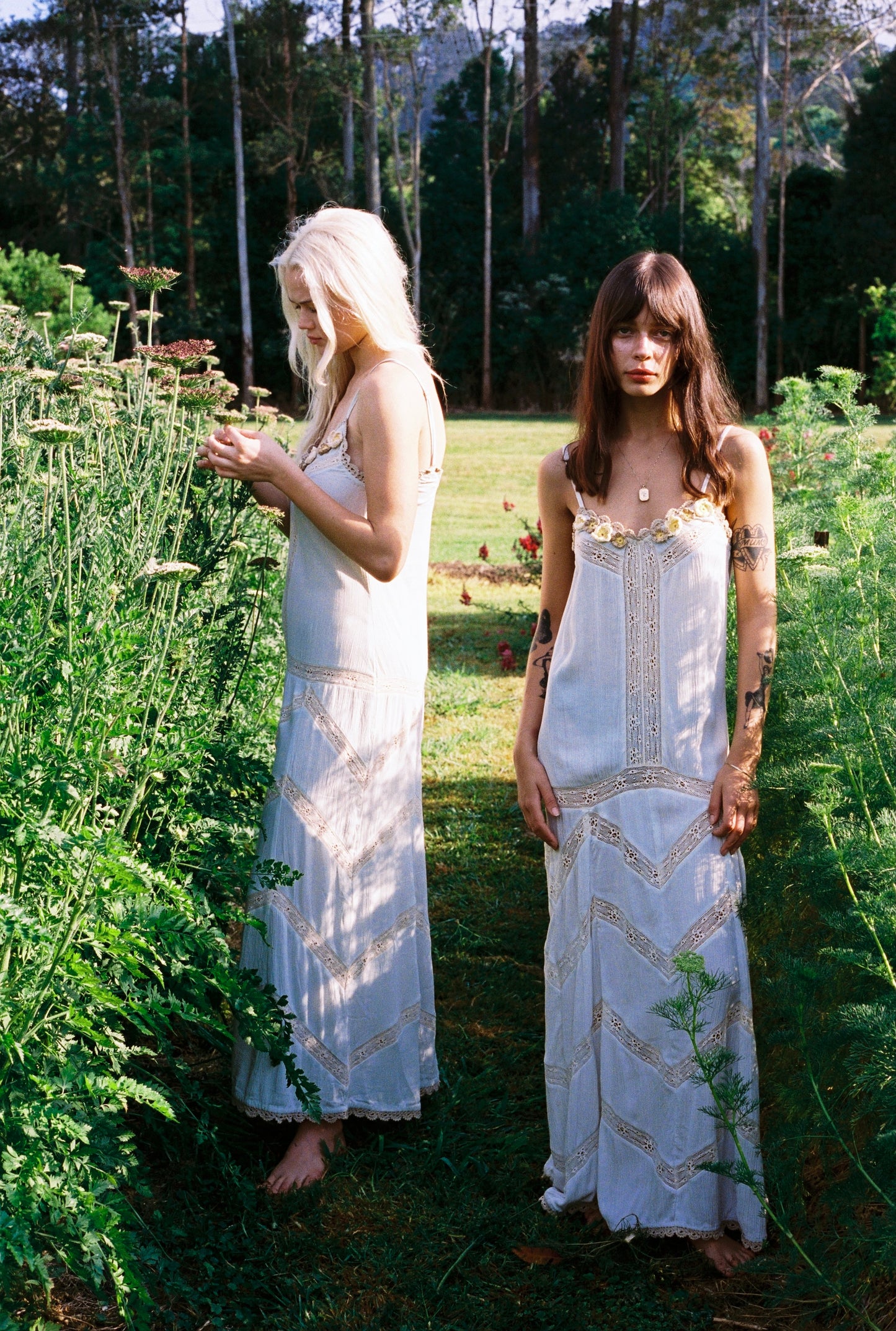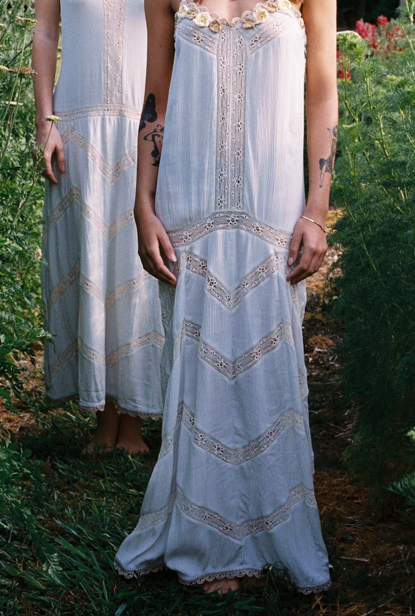 Our etherial Fae Slip now in a sweet pale baby blue. Features hand crochet flowers and neckline, drop waisted design with adjustable straps and the most stunning panel skirt set in chevrons of delicate lace.