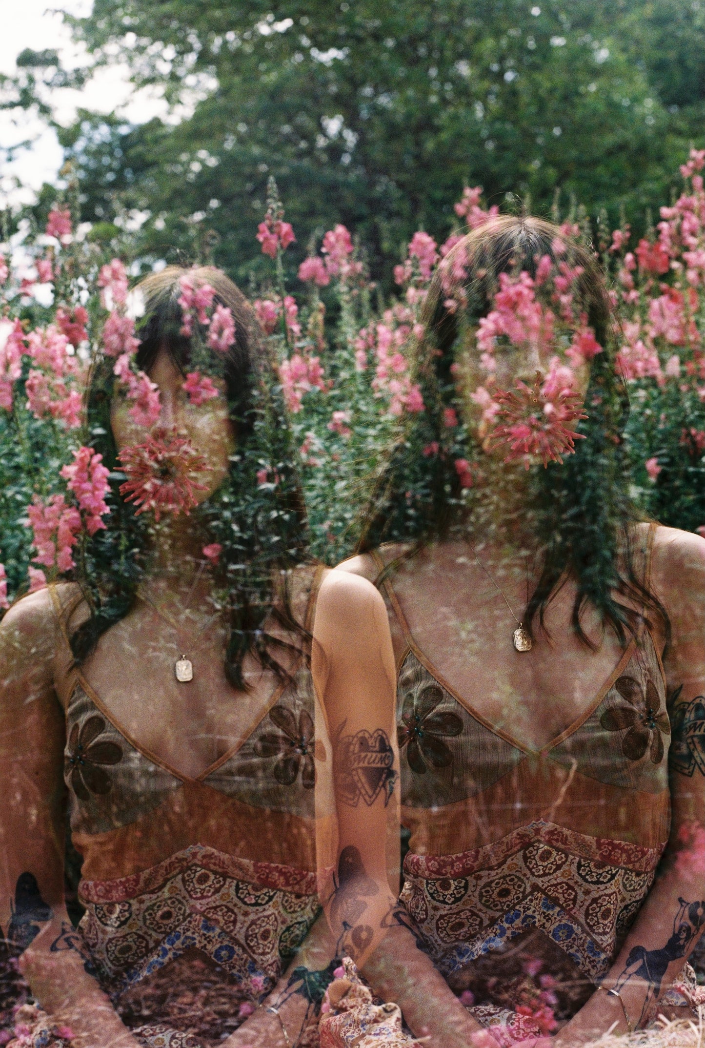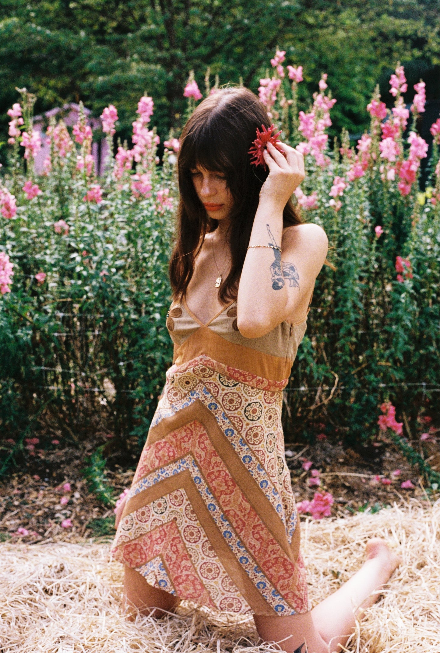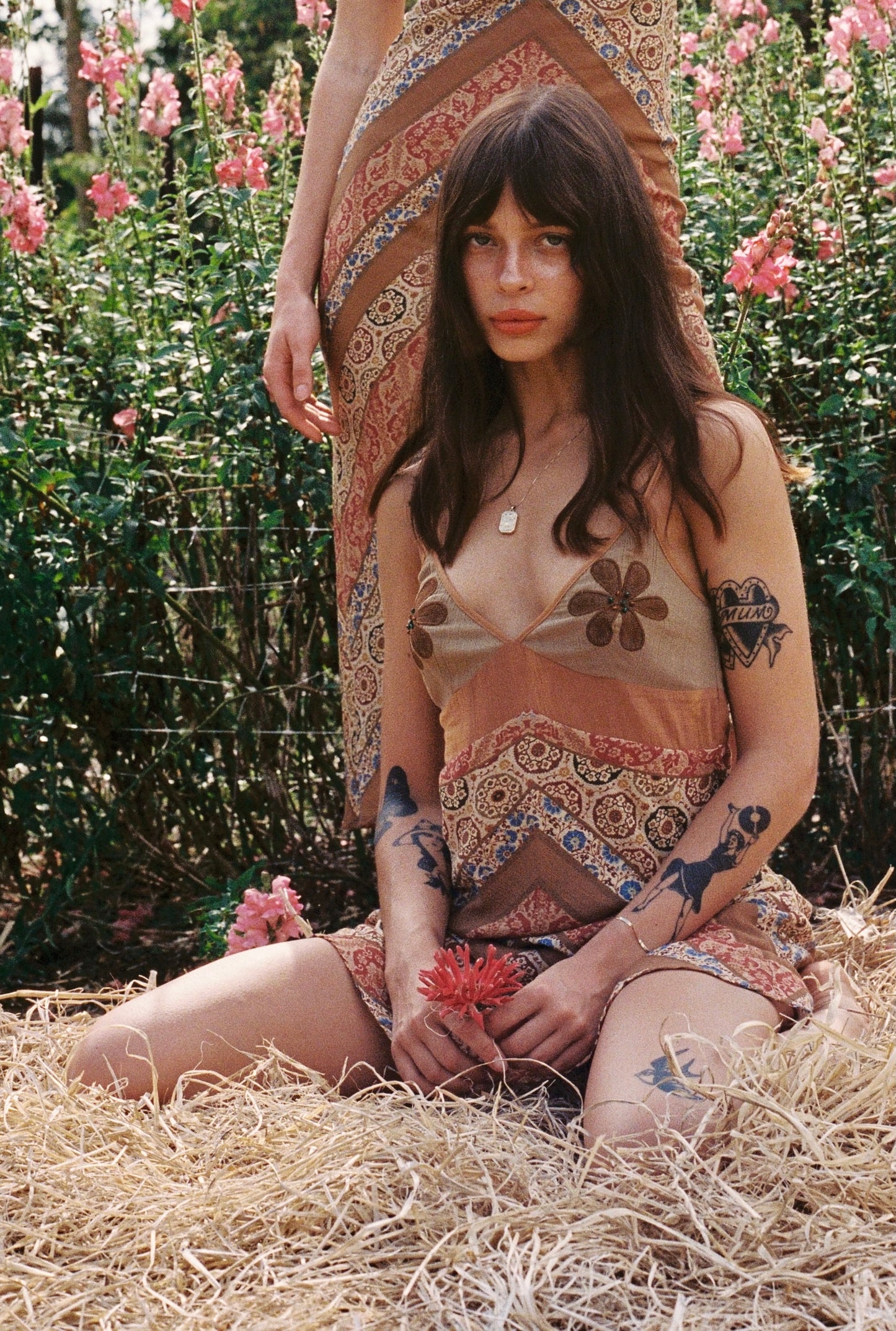 Cut from a light crinkle cotton in a deliciously earthy chevron print, the Planet Caravan features fitted bust with embroidery and seed bead detailing, adjustable straps and bias cut skirt with lining.